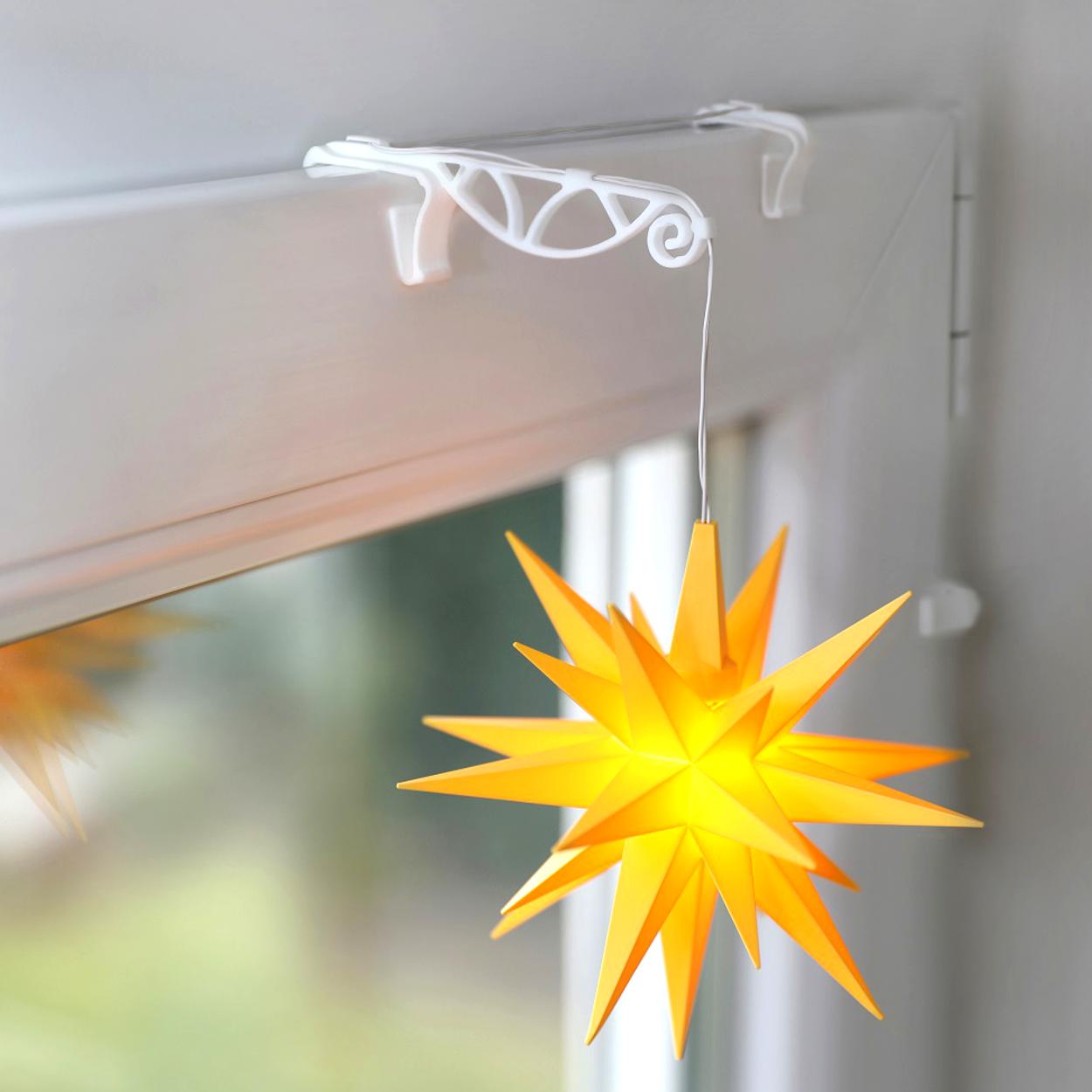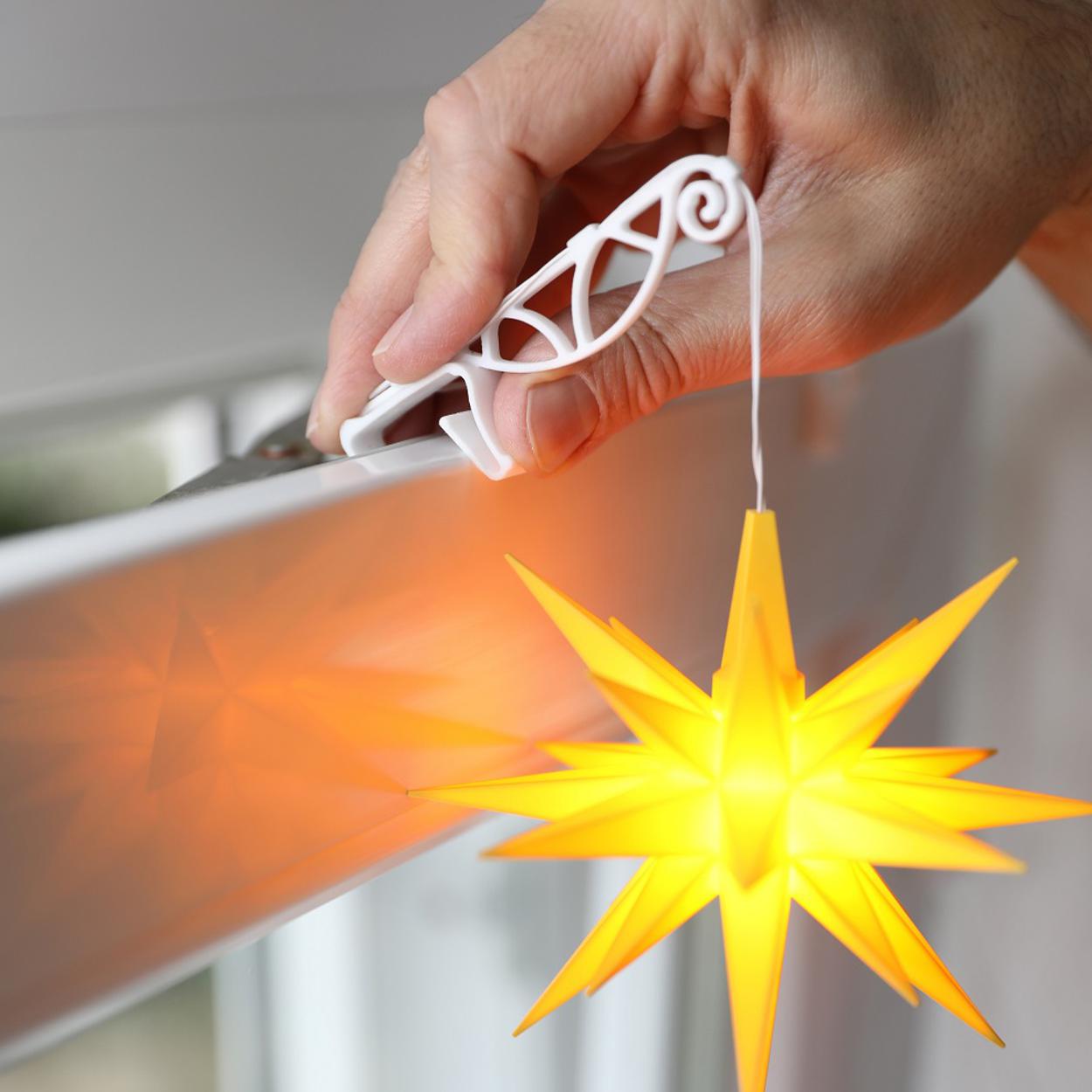 Mit dem Sternhalter können Sie Ihre kleinen Adventssterne (egal ob Marienberger, Herrnhuter oder selbst gebastelte Sterne) direkt mit dem Kabel am Fenster aufhängen. Der Sternhalter wird dazu nur oben in den Fensterflügel eingeclipst und schon kann man den Stern einfach aufhängen.