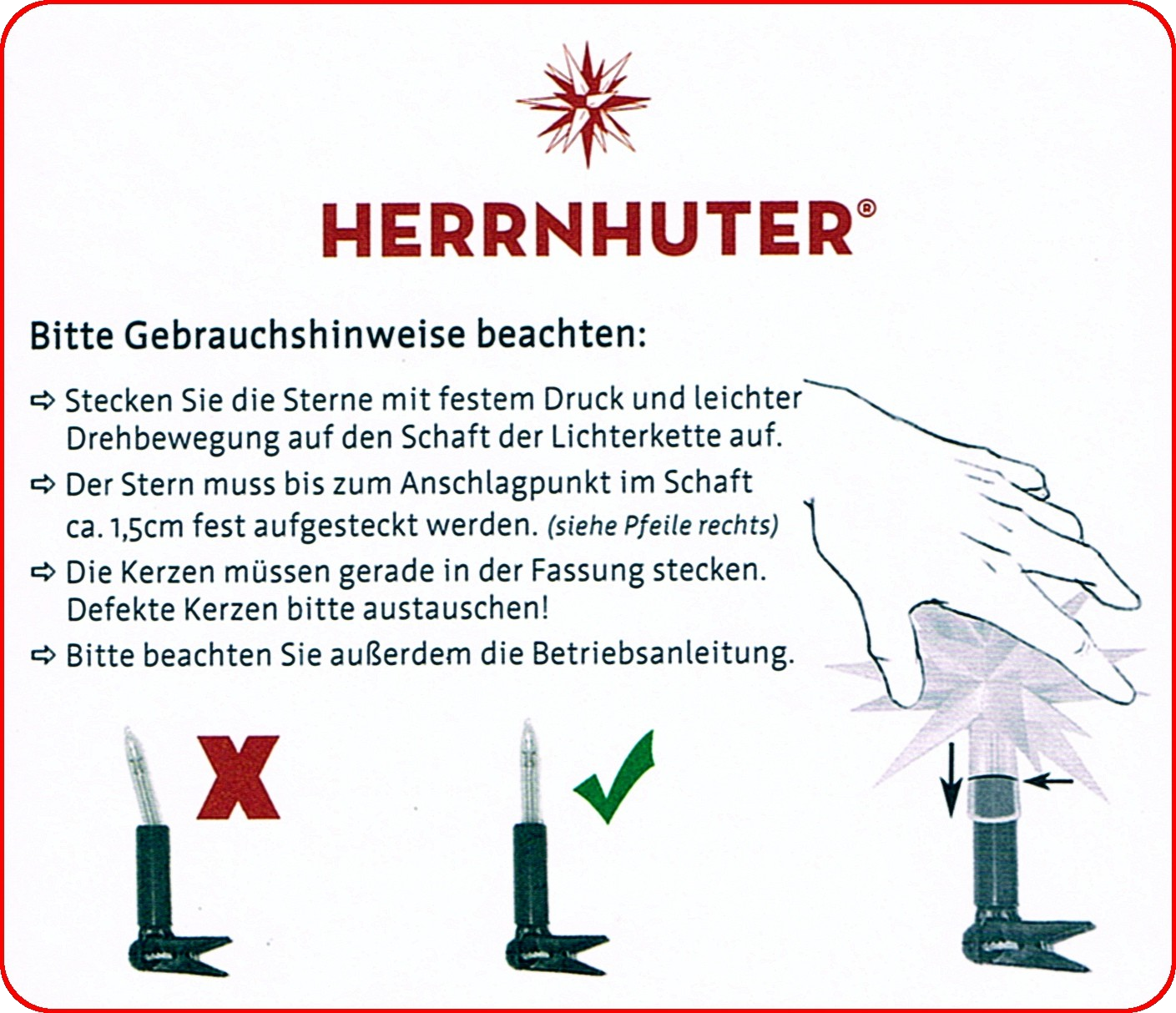 Beim Wechsel von Kerzen bzw. Leuchtmitteln der Herrnhuter Lichterketten, gilt es zu brachen, dass die Sterne mit festem Druck und leichter Drehbewegung auf die Kette aufgesetzt werden müssen. Die Kerzen sollten dabei gerade in der Fassung stecken. Bitte beachten Sie die jeweilige Betriebsanleitung Ihrer Lichterkette.